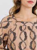 The Alexis returns for the season - this time as a long sleeve mini dress! Featuring hand screen printed fabric in a neutral leafy pattern, subtle whip stitched embroidery on the neckline, and cute ruffle cuffs, this dress is big on style details. Adjust the removable belt for a defined waist, or omit it entirely for a throw-on-and-go shirt dress aesthetic. This mini hits above the knee, but long sleeves and an easy, loose fit make this a look anyone can pull off.