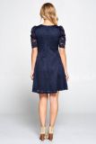 Lace Floral Dress with Puff Sleeve and Lining - NAVY