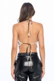 Made in USA Satin Print Backless Tie Top. Available in other Colors. Fabric content: 97% Polyester, 3% Spandex.