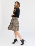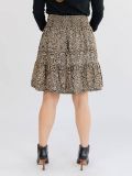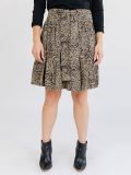 This cotton ruffle skirt hits just above the knee and features a tie front and elastic waistband in back for the perfect style and comfort combo. The standout of this pull-on skirt is its gorgeous hand block printed fabric with black, grey, and golden tones.