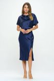 Made in USA Satin Stretch Print Dress with Slit. Available in other Colors. Fabric content: 97% Polyester, 3% Spandex.
