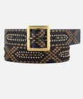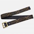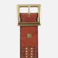 The geometric designs on this leather belt are sure to add glam to your boho style. With a beautiful mix of bronze, gold, & dark metal studs – this design is a showstopper at every level. Your T-shirt & jeans never looked better than they do with this studded beauty slipped around your waist.