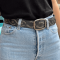 You've entered a bohemian dream with this silver studded belt for women wrapped around your waist. Perfect with a white T-shirt & jeans, this studded leather belt can make the right kind of boho fashion statement. Featuring antiqued silver studs in a unique swirled design and a rounded rectangular buckle. Denim & shades of brown are great tones to highlight this fun & fashionable leather belt for women. Studded belts are strong closet staples that remain vintage & timeless.